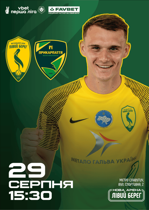 У п'ятницю, 29 серпня, київський «Лівий Берег» прийме «Прикарпаття-Благо» з Івано-Франківська в межах 4-го туру VBET Першої ліги. Початок матчу на Арені «Лівий Берег» - о 15:30. Вхід на стадіон відкриється о 14:30.