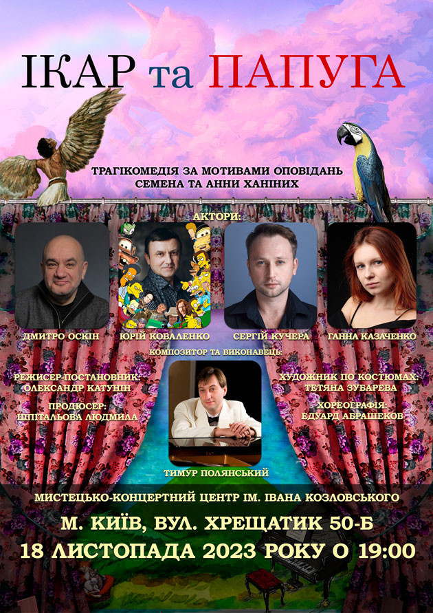 «Ікар та папуга» може стати цікавою подією у Вашому житті. А ще у виставі будуть пісні і танці. Чекаємо на зустріч. Сумно не буде.