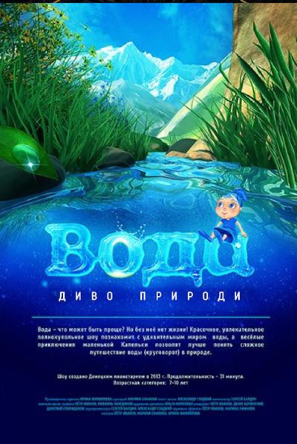 Другий фільм присвяченій найважливіший рідині на Землі - воді. Без неї на планеті не було б життя. Наше повнокупольне шоу буквально занурить кожного глядача в залі у цю природну стихію. А щоб не загубитись у круговороті води, вашим супутником у цій захоплюючій подорожі стане наша героїня Крапелька.