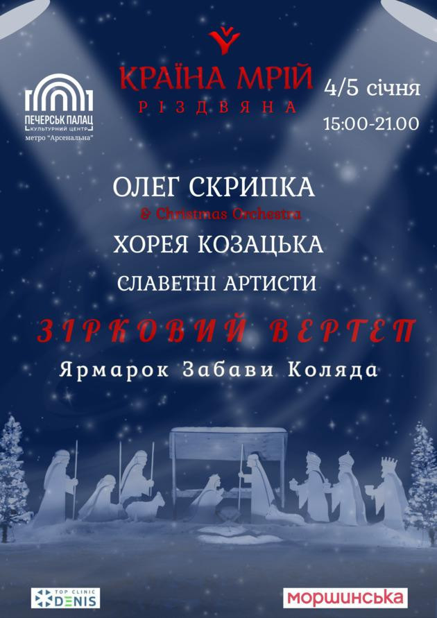 4 та 5 січня гречно запрошуємо вас на "Країну Мрій" Різдвяну, прямо у серці старого Києва вас прийме затишний "Печерськ Палац"! І то стане справжня феєрія українського духу: старовинні колядки, душевні пісні від знаних виконавців, дитячі забави та майстер-класи, звичайно ж, вже традиційний, Зірковий Вертеп, де відомі українці розіграють класичну різдвяну містерію! Тож створимо разом неймовірну атмосферу українського Різдва! Чекаймо у Країні Мрій!