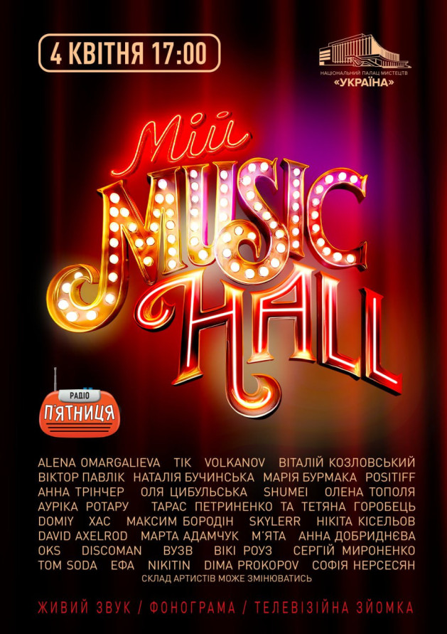На одній сцені зберуться найкращі українські артисти. Живий звук, феєричні постановки, телевізійна зйомка — усе це «Мій MUSIC HALL»!