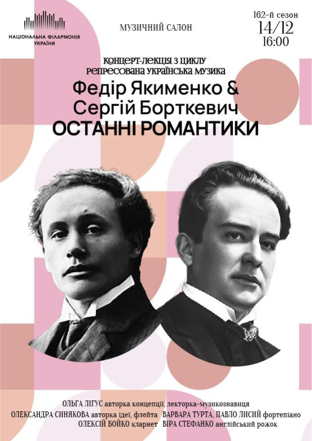 Репресована українська музика - та , якій радянська влада заборонила звучати, а імена її авторів викреслила з історії культури. Так сталося з музикою Федора Якименка та Сергія Борткевича, які покинули батьківщину після наступу більшовицького режиму. Ціна свободи виявилася для них непростою : скрута , самотність , поневіряння та смерть на чужині. І все ж , обидва композитори знаходили сили для творчості - національно виразної , сповненої щемливих спогадів , світлих надій та романтичного піднесення . Під час концерту - лекції говоритимемо про історичний та художній контекст , в якому жили й творили ці митці , та слухатимемо їхню талановиту музику .