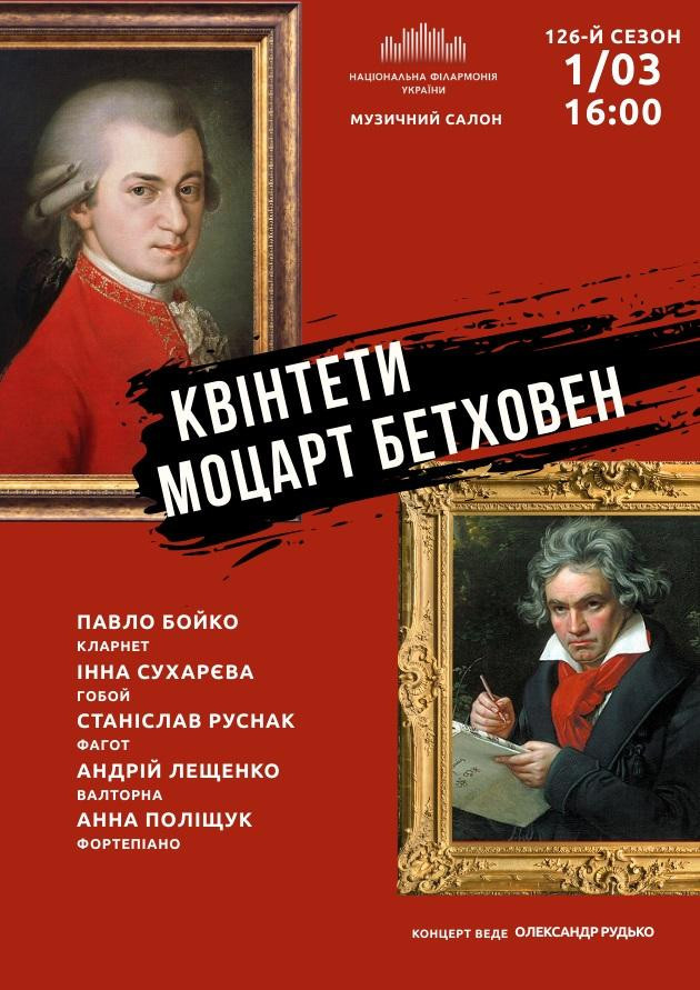 Програма КВІНТЕТИ. МОЦАРТ, БЕТХОВЕН складається з двох фортепіанних квінтетів для духових та фортепіано Вольфганга Амадея Моцарта (Квінтет Es–Dur) та Людвіга ван Бетховена – (Квінтет Es–Dur) і Рондо-капричіо G–Dur Бетховена. Період класицизму в музичному і загалом мистецькому просторі є тим зразком, до якого музиканти-виконавці звертаються як до ідеалу, прагнучи долучити до цієї висоти публіку. Тому музика композиторів тієї доби повинна постійно лунати в найкращих залах світу. А твори, що рідко виконуються і, відповідно, є маловідомими, тим більше мають бути доступними. Саме це й ставиться за мету в програмі, яку виконають Павло Бойко (кларнет), Інна Сухарєва (гобой), Станіслав Руснак (фагот), Андрій Лещенко (валторна) та Анна Поліщук (фортепіано).