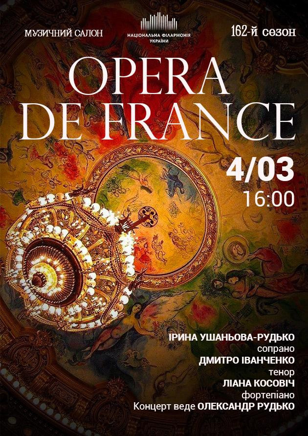«Grand opera de France» – це вечір великої французької опери, що занурить слухачів у світ витонченої драматургії, пристрасті та безсмертної краси музики. У Музичному салоні Національної філармонії України прозвучать арії та дуети з найвідоміших опер французького репертуару: Ж. Бізе – «Кармен», Ш. Гуно – «Фауст»,Ж. Оффенбах – «Казки Гофмана».