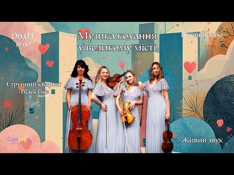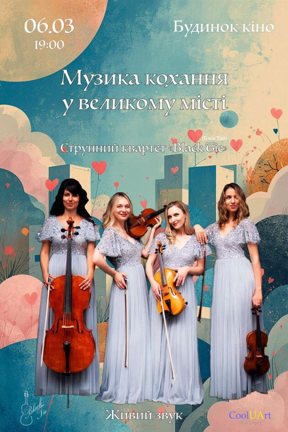 Найулюбленіші композиції у виконанні чарівного струнного квартету «Black Tie» створять святкову романтичну атмосферу та подарують справжню насолоду від неперевершеного живого звучання!