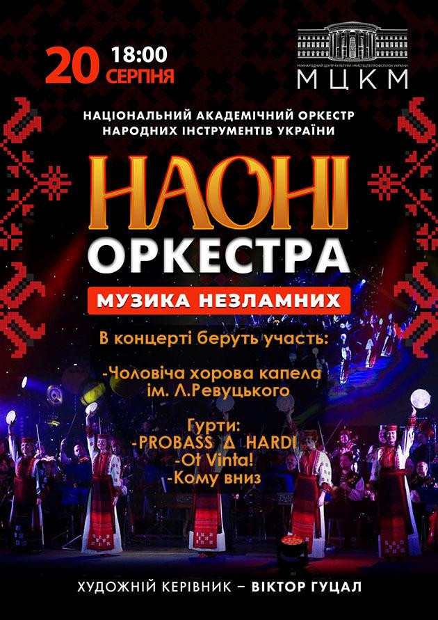 На вас чекає справжній вибух яскравих емоцій та захоплення від професійного виконання артистів Національного академічного оркестру народних інструментів України, які підкорили своїми виступами всі провідні світові сцени. Програма «Музика Незламних» – це визначні композиції, які ідентифікують українську націю, мужність, сила та незламність української нації, непохитна віра в перемогу у звучанні Оркестру!