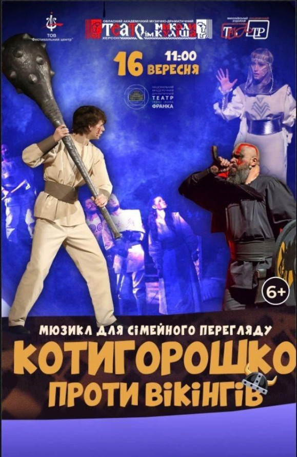 Мюзикл для сімейного перегляду "Котигорошко проти вікінгів» - це спільний проєкт Херсонського і Миколаївського театрів з інтерактивом для дітей, яскравими костюмами, елементами театру тіней і дотепними жартами! Це історія звичайного хлопчика, який не вирізняється фізичною силою, проте має напрочуд добре серце, міцний дух і врешті стає справжнім героєм.