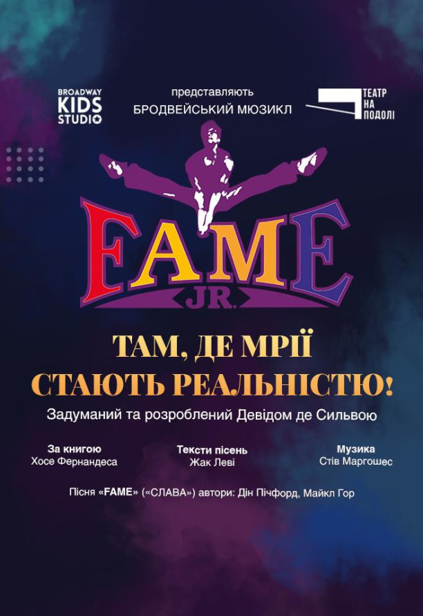 На професійну сцену Театру на Подолі вийдуть майже 40 юних артистів - вихованці Broadway Kids Studio, вокальний ансамбль «Забава», хореографічний ансамбль «Фламінго», а також талановиті діти віком від 11 до 18 років, яких відібрали на кастингах - і зіграють англійською мовою ліцензійний американський мюзикл «FAME Jr.»