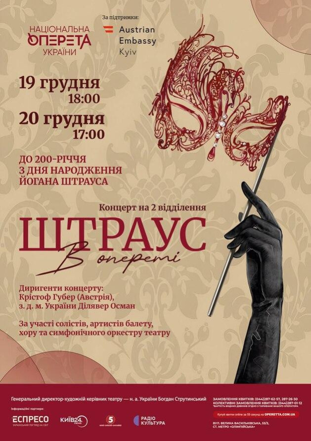 У Київському Національному академічному театрі оперети відбудеться новорічний концерт «Штраус в опереті». Ця неймовірна зустріч з чарівною музикою родини Штраусів стала вже традиційною для киян і гостей міста. Цього вечора прозвучать як і відомі твори композиторів, так і ті, які досі не виконувались в Україні.
