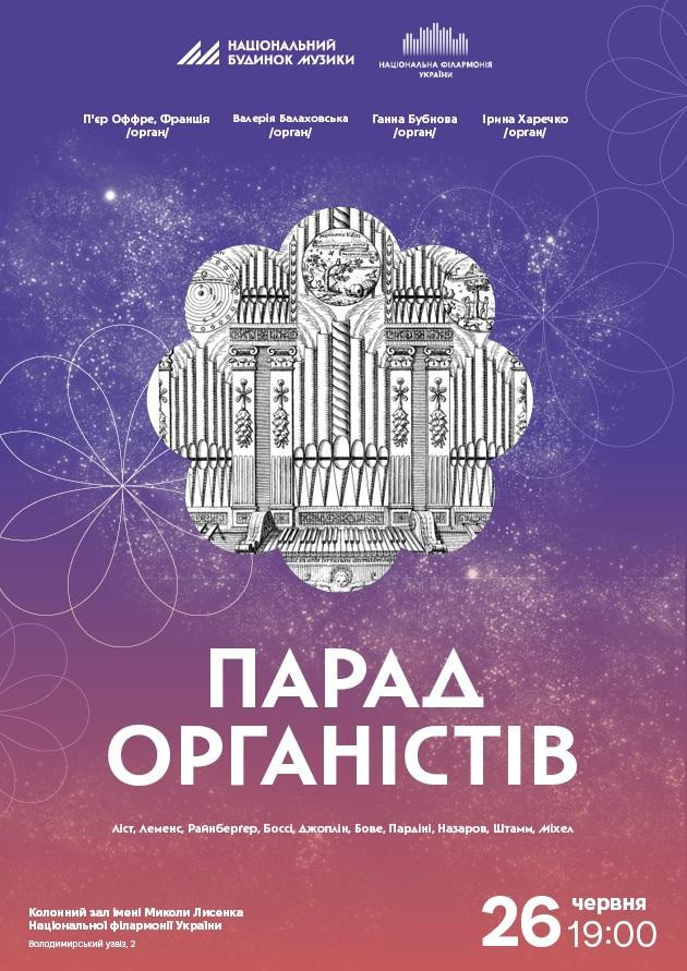 Традиційно завершуємо сезон органної музики розмаїтою добіркою творів, створених для цього величного інструмента. Солістки Національного будинку музики зійдуться у незабутньому параді органістів та виконають яскраву палітру органних творів різних часів: від романтизму до джазу. Поруч з вашими улюбленими органістками виступить запрошений виконавець — французький органіст, лауреат престижних міжнародних конкурсів Пʼєр Оффре.