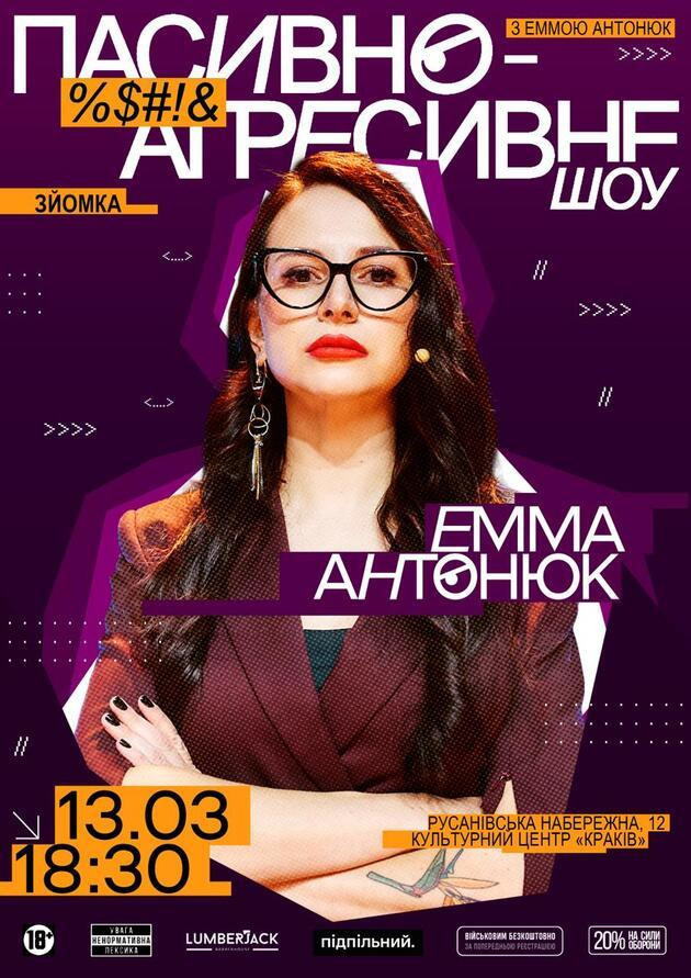 Запрошуємо на стендап-шоу «Пасивно-Агресивне» з Еммою Антонюк. Це новий проєкт від Підпільного Стендапу, де коміки змагаються за звання найсмішнішого. Вони пройдуть кілька етапів випробувань, щоб зʼясувати хто дійсно володіє почуттям гумору, а кому пора шукати нову роботу!