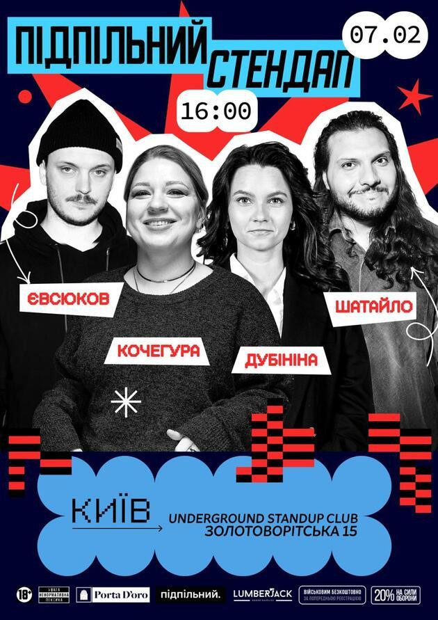 *вхід для бійців ЗСУ та ТРО - безкоштовний (за попереднім записом в інстаграм @undergroundstandupkyiv)