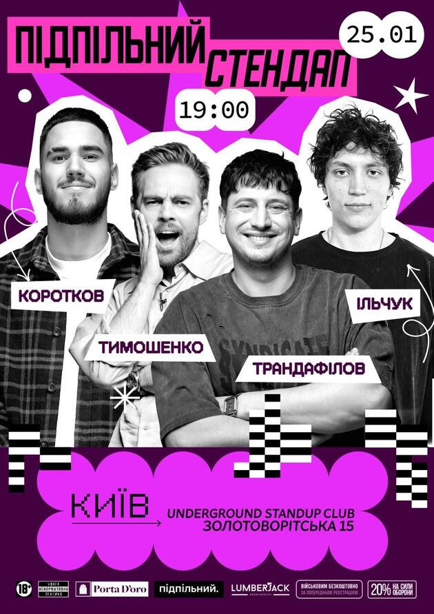 *вхід для бійців ЗСУ та ТРО - безкоштовний (за попереднім записом в інстаграм @undergroundstandupkyiv)