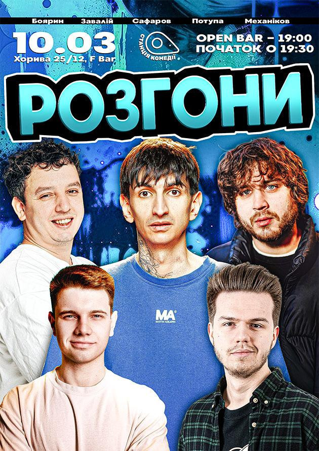 Вас чекає легендарне імпровізаційне шоу «Розгони» — шоу, де професійні коміки розповідають історії або життєві спостереження та разом накидують на них жарти. Побач процес написання стендапу на власні очі!
