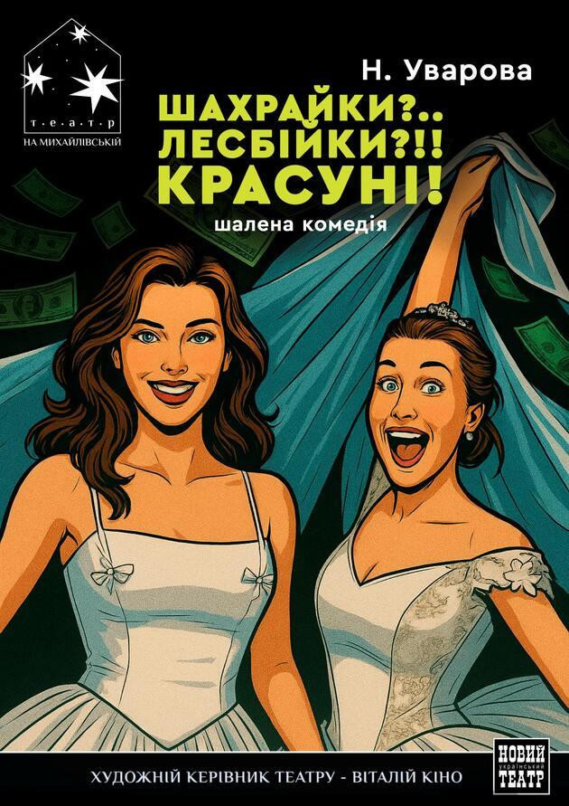 У Новому українському театрі на Михайлівській відбудеться вистава “Шахрайки?..Лесбійки?!! Красуні!” в Києві! Хто вони? Жулька і Оля - звичайні дівчата, які працюють, винаймають одну кімнату на двох і намагаються якось вижити в безгрошів’ї. Але все змінюються, коли обидві втрачають роботу і останні гроші. Саме тоді починається низка карколомних подій, у які вони потрапляють самі, і втягують інших. Однак все буде добре, бо невтомна Жулька ще й не з такої води виходила сухою.