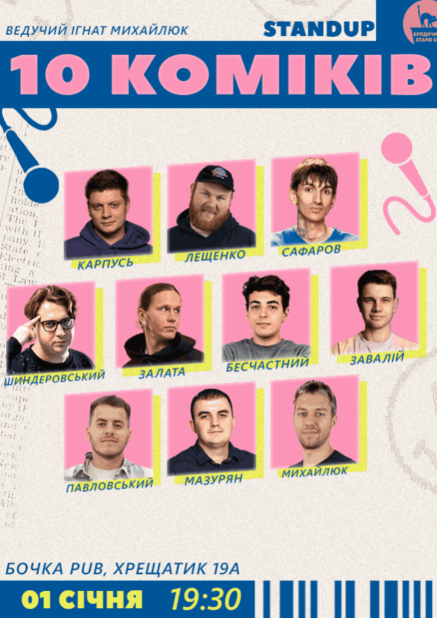 Цього вечора 10 молодих коміків виступатимуть по 6 хвилин, кожен з них поділиться з вами частиною життя за допомогою жартів. Коміки розповідають як свої “топові” (перевірені) жарти, так і нові, актуальні, котрі ви, можливо, почуєте першими.