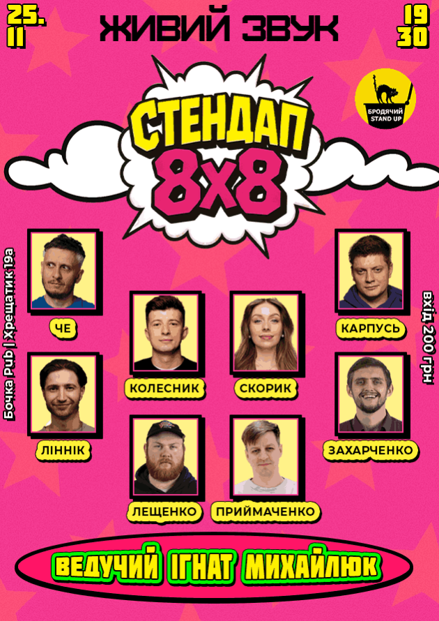 Цього вечора для вас виступатимуть 8 талановитих коміків, і кожен із них має лише 8 хвилин, щоб розсмішити вас до сліз своїми новими жартами! Це буде вечір свіжих ідей, несподіваних поворотів і вибухових моментів. Не пропустіть шанс стати частиною цього унікального стендап-шоу – вечора коротких, але яскравих виступів, де кожен комік покаже свій максимум.