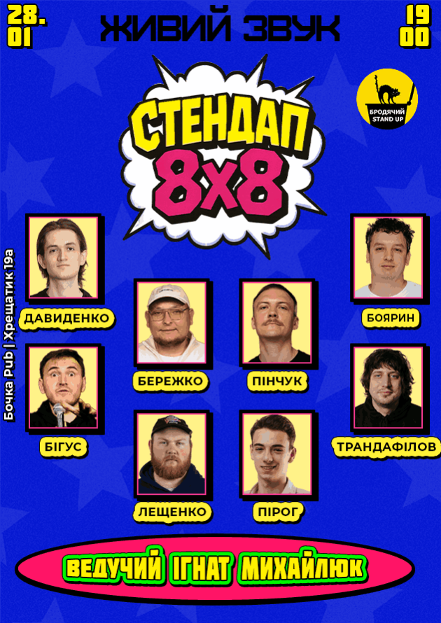 Цього вечора для вас виступатимуть 8 талановитих коміків, і кожен із них має лише 8 хвилин, щоб розсмішити вас до сліз своїми новими жартами! Це буде вечір свіжих ідей, несподіваних поворотів і вибухових моментів. Не пропустіть шанс стати частиною цього унікального стендап-шоу – вечора коротких, але яскравих виступів, де кожен комік покаже свій максимум.