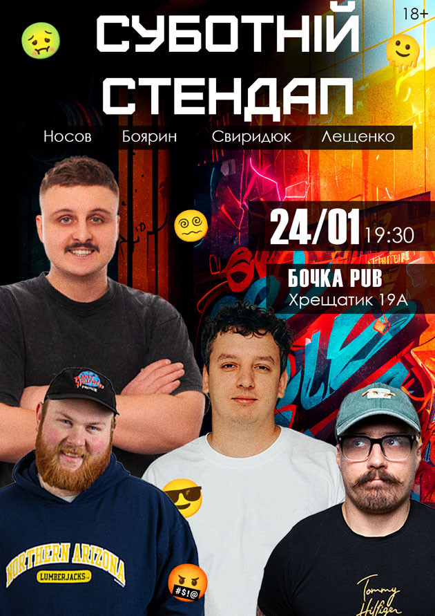 Це вечір із потужно підібраним складом виступаючих. Коміки, які вже мають досвід виступів, пройшли низку сцен і налаштовані на потужний вечір, подарують максимум класного настрою і ряд несподіваних висновків. Формат вечора передбачає перебування виступаючого на сцені довше звичайного, що дозволяє не намагатися скоротити думку, а максимально розгорнути глядачеві свій напрацьований та перевірений матеріал. 1. Дмитро Носов @nosovdima 2. Богдан Боярин @bod1qa 3. Марк Свиридюк @sviridyuk.mark44 4. Євген Лещенко @lytsemirniy Ведучий: Ігнат Михайлюк @ihnat_mykhailiuk Коли: 24/01 19:30 Де: Бочка Pub (Хрещатик 19А) Підписуйтесь на Бродячий Стендап в Instagram, щоб знати про всі наші заходи заздалегідь. 18+