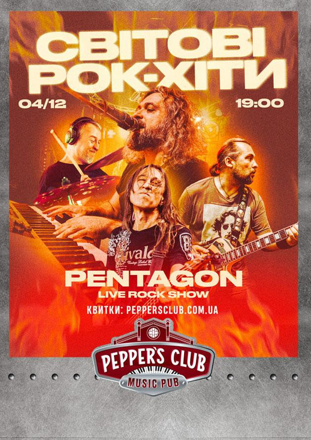 4.12 Світові рок-хіти by Pentagon 19:00 Гурт Pentagon з програмою «Світові рок-хіти» — живий звук, емоції та легендарні пісні — в Pepper’s. Цього вечора: — Твори, що змінили історію жанру: композиції The Beatles, Queen, Ozzy Osbourne, Deep Purple, AC/DC, Whitesnake, Elton John, CCR та інші легенди! — Сучасні аранжування культових хітів в авторському виконанні гурту Pentagon. — Команда професійних музикантів із понад десятирічним досвідом — це щирі емоції та музична майстерність. Це музична подорож для всіх, хто любить якісний рок, насолоджується живою музикою та теплою дружньою компанією.