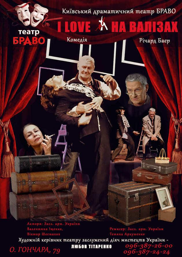 У театрі «Браво» в Києві відбудеться вистава I LOVE НА ВАЛІЗАХ. Це історія про випадкову зустріч двох людей. Чоловіка і жінки. Про те, що кохати і жити можна у будь-якому віці. Що надію на щастя можна зберегти на всі часи. Ці двоє -розумні і дотепні і говорять про життя, про смерть і про щастя. Про те, що головне і що — другорядне. Говорять так, що їх можна слухати нескінченно. Та замислюватись про своє життя. У якому можна не лише втратити, а й знайти. Мудра історія у Новорічні свята. Не пропустить! Адже час повільний лише у дитинстві.