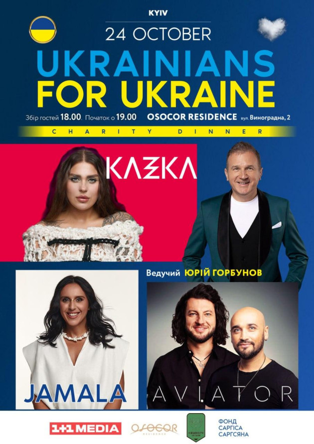 24 жовтня, у вівторок, у Києві відбудеться благодійний вечір “Ukrainians for Ukraine”, який організовують волонтери задля підтримки Сил безпеки й оборони України та дітей-переселенців. У межах події виступатимуть відомі українські зірки - співачка Джамала, гурти Kazka та Авіатор, а ведучим заходу стане Юрій Горбунов.