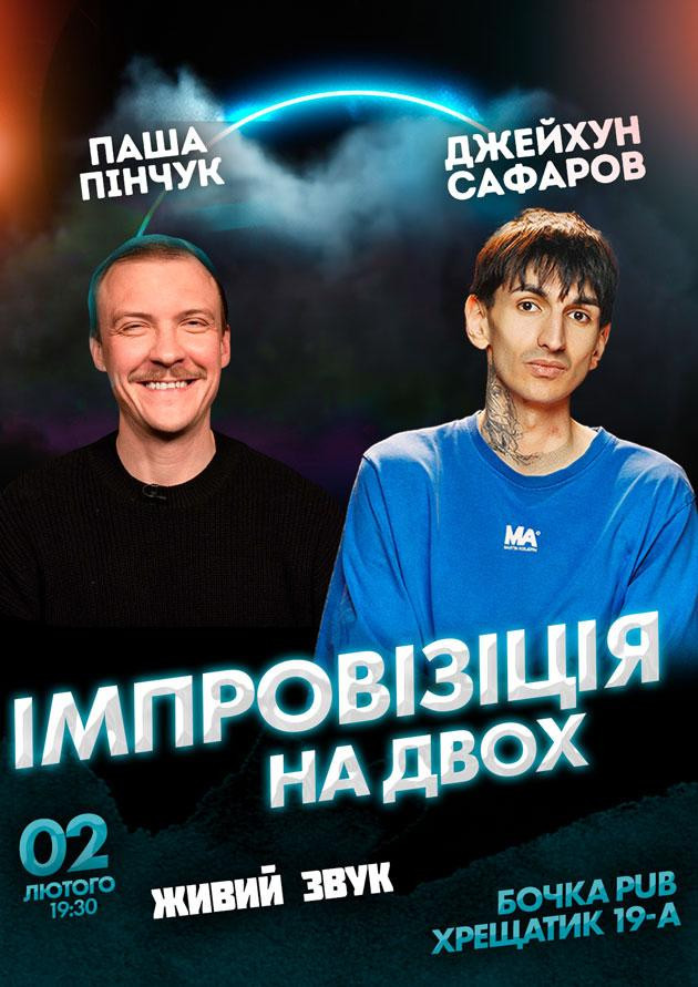 Вечір Імпровізації Джейхуна Сафарова та Паши Пінчука— це незабутня подія для всіх, живе спілкування та справжні емоції. Паша Пінчук та Джейхун Сафаров будуть імпровізувати на сцені удвох. Талановиті коміки з неперевершеним почуттям гумору, запрошують всіх на вечір, де можна посміятися від душі, занурившись у їхні спостереження за повсякденним життям, стосунками, абсурдністю сучасного світу та особистими пригодами.