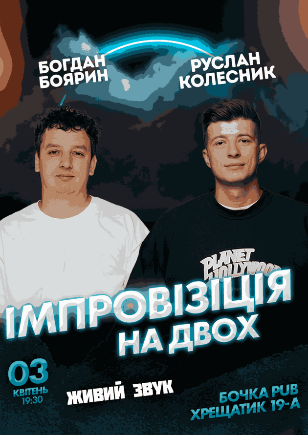 Вечір Імпровізації Богдана Боярина та Руслана Колесника — це незабутня подія для всіх, живе спілкування та справжні емоції. Руслан Колесник та Богдан Боярин будуть імпровізувати на сцені удвох. Талановиті коміки з неперевершеним почуттям гумору, запрошують всіх на вечір, де можна посміятися від душі, занурившись у їхні спостереження за повсякденним життям, стосунками, абсурдністю сучасного світу та особистими пригодами.